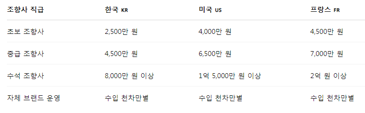 ✅ 한국의 초보 조향사 연봉은 약 2,500만 원에서 시작하며, 수석 조향사는 1억 원 이상 받는 경우도 있습니다.