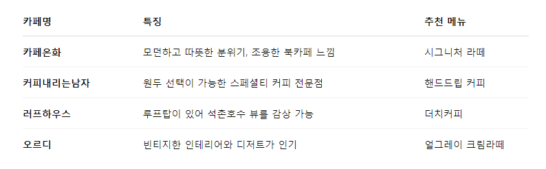 - 대표적인 카페로는 ‘카페온화’, ‘커피내리는남자’ 등이 있습니다.